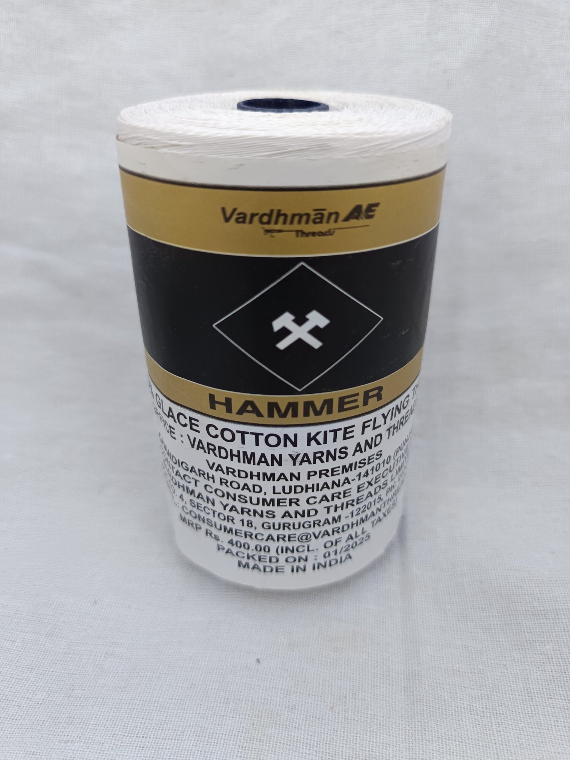 Introducing the 6 Cord Vardhman Hammer Article E-8400 White Cotton Thread, a perfect combination of strength, smoothness, and control for everyday kite flying and competitive use. Made from 100% pure white cotton, this premium thread delivers reliable performance while maintaining the traditional quality of Bareilly’s famous manjha.